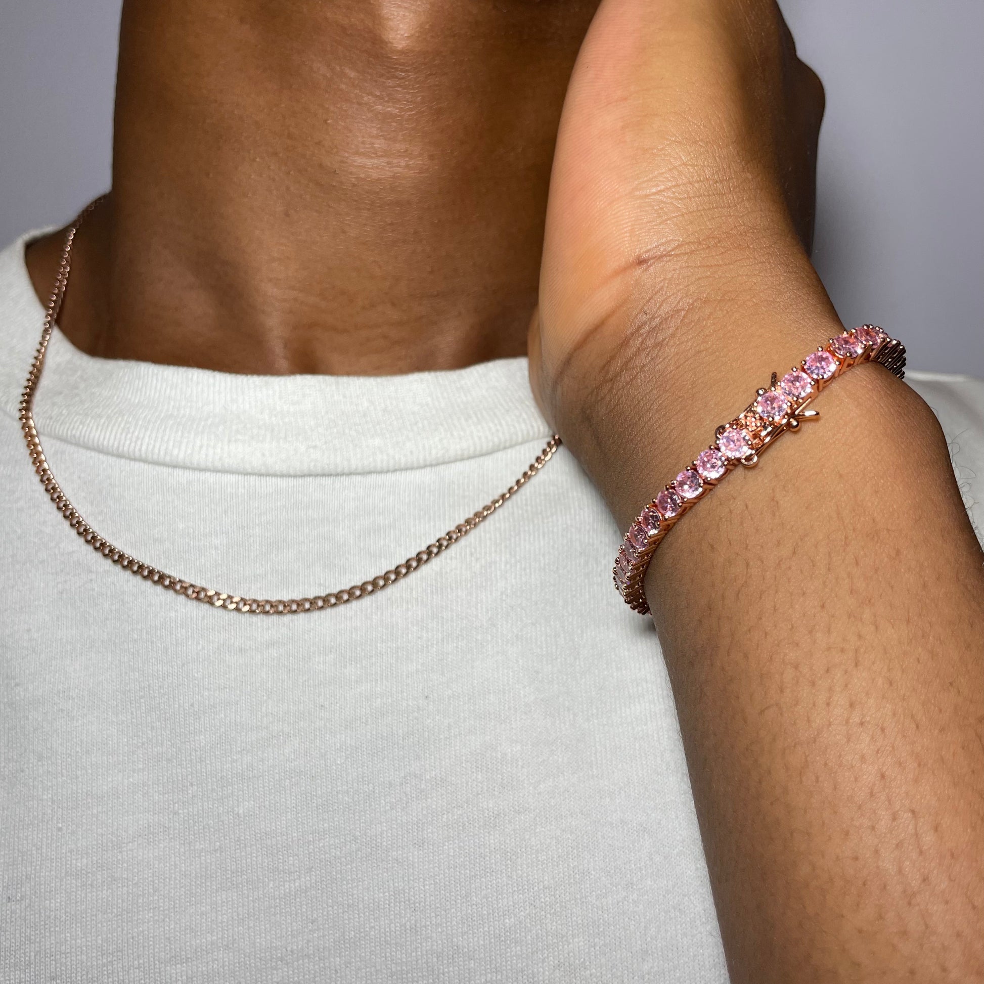 This unique piece is set in plated rose gold with numerous small, high-quality, flawless pink cubic zirconia gemstones evenly spaceThe rose gold plating gives it a warm sophisticated look complementing the pink stones. It’s a great choice for those who want to express their elevated and unique style.